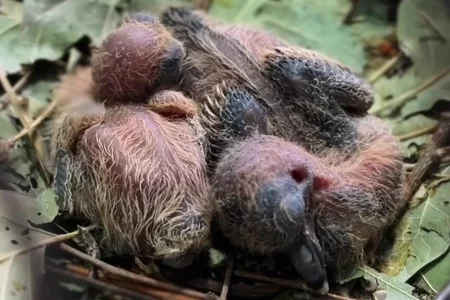 Сообщается, что австралийская хохлатая горлица стала мамой двойни. Она высидела двух птенцов. Недавно они появились на свет. Работники парка засняли на видео милые кадры. На них новорожденные птенцы лежат, как будто бы, в обнимку.