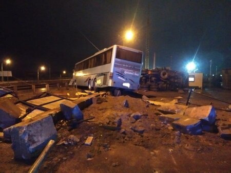 В районе 930-го километра трассы, он врезался в бетонные ограждения в месте проведения дорожных работ по реконструкции моста. О т удара общественный транспорт с шестью пассажирами отбросило в припаркованный Камаз 65115.