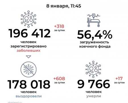 Региональный Роспотребнадзор 8 января сообщил о новых 318 заразившихся коронавирусом за сутки в Ростовской области. За весь период пандемии инфекция была выявлена у 196412 дончан. Из них 178018 человек уже выздоровели.