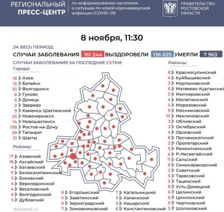 Региональный Роспотребнадзор 8 ноября сообщил о 649 заразившихся коронавирусом за сутки в Ростовской области. Инфекция выявлена во всех городах и районах Дона. Общее количество зараженных за весь период пандемии достигло 161244.