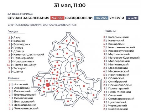 Новые случаи заболеваний выявлены в 41 городе и районе области. Лидером антирейтинга по-прежнему остается Ростов – 65 инфицированных. По семь новых случаев в Аксайском районе, Батайске и Таганроге. По пять в Новочеркасске, Каменском, Красносулинском и Неклиновском районах.