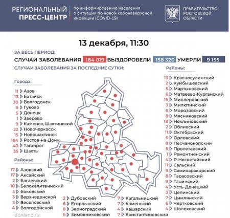 В стационары госпитализированы 3335 пациентов, 40 человек в тяжелом состоянии, подключены к аппаратам ИВЛ. Скончались от инфекции 26 человек за сутки, и на 13 декабря общее число погибших на Дону от коронавируса и сопутствующих заболеваний составило 9155 человек.