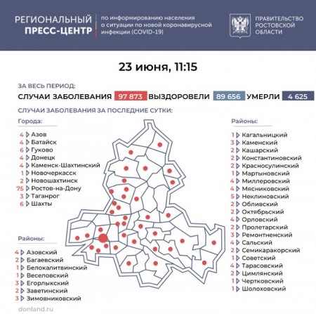 Региональный Роспотребнадзор 23 июня сообщил о 177 новых случаях коронавируса в Ростовской области за сутки. И общее количество заразившихся за весь период пандемии приближается к психологическому порогу. На 23 июня заболевших 97873 человек, из них выздоровели 89656 человек.