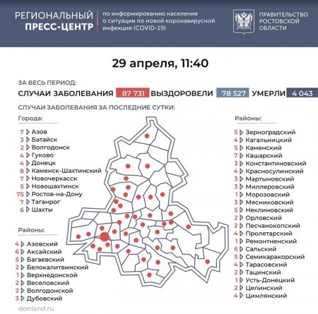 Количество заразившихся COVID-19за весь период пандемии дончан увеличилось за последние сутки на 229 человек и составило 87731 человек. Как сообщил 29 апреля региональный Роспотребнадзор, из них выздоровели 78527 человек.
