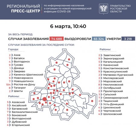 Заболевшие зафиксированы в Ростове (104), Гукове (9), Новочеркасске (9), Зерноградском (9), Красносулинском (9) районах, Таганроге (8), Неклиновском (8) районе, Батайске (7). В остальных территориях новых пациентов по несколько человек.
