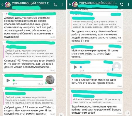 Однако в чате управляющего совета гимназии идет дискуссия в несколько ином ключе. Председателям родительских комитетов отправили сообщение о том, что 5000 рублей с класса - это обязательный сбор.