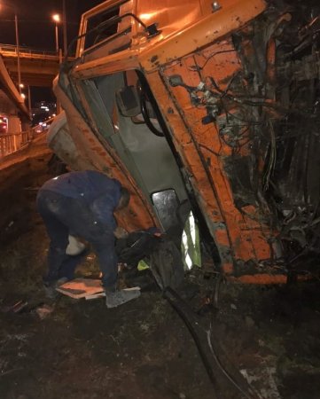 Водитель грузовика двигался по мосту и не справился с управлением. Машина протаранила дорожное ограждение и упала вниз на обочину дороги. К счастью, не на проезжую часть - в момент падения «миксера» рядом не было людей и других автомобилей. Об этом 16 ноября сообщил портал Donday.