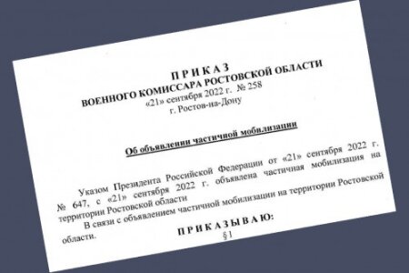 Военным комиссаром Ростовской области Игорем Егоровым подписан приказ об объявлении частичной мобилизации. Текст документа содержит шесть параграфов, - говорится в сообщении.