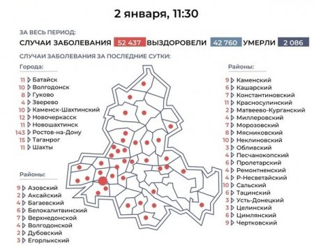 Так, новые инфицированные 2 января выявлены в 38 территориях. Лидируют Ростов (143), Таганрог (15), Новочеркасск (12), Батайск (11), Новошахтинск (11), Шахты (11) и Красносулинский район (11). Похожая картина зафиксирована и накануне, 1 января: в Ростове – 149 новых заболевших, в Батайске и Новошахтинске – по 15, в Таганроге и Белокалитвинском районе- 14, Новочеркасске – 13, Сальском районе – 12.