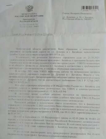 В последнем ответе прокуратуры жителям Думенко от 25 мая 2022 года говорится, что обращение в мэрию под номером «стопятьсот» о включении расходов на благоустройство и капремонт улицы в бюджет на 2022 год зарегистрировано. Однако Управление ЖКХ ответ на обращение жителям не направило, как, в принципе, и ранее. В связи с чем главе администрации Батайска (который, кстати, сейчас находится в процессе своего назначения) внесено представление.