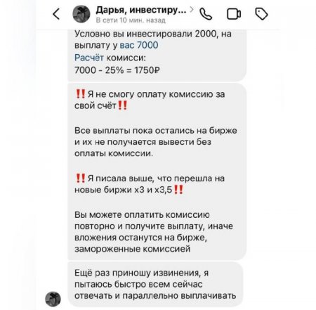 Некая Дарья предлагает якобы внести инвестиции, оплатить комиссию, после чего пропадает.