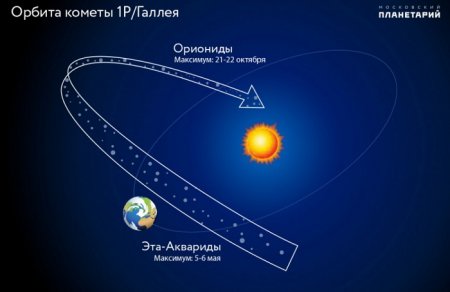 – Орбита кометы Галлея дважды пересекает орбиту Земли и оставшиеся на ней частички кометной пыли устремляются в земную атмосферу дважды в год, образуя метеорные потоки: весной – Майские Аквариды, а осенью – Ориониды, - разъясняют специалисты.